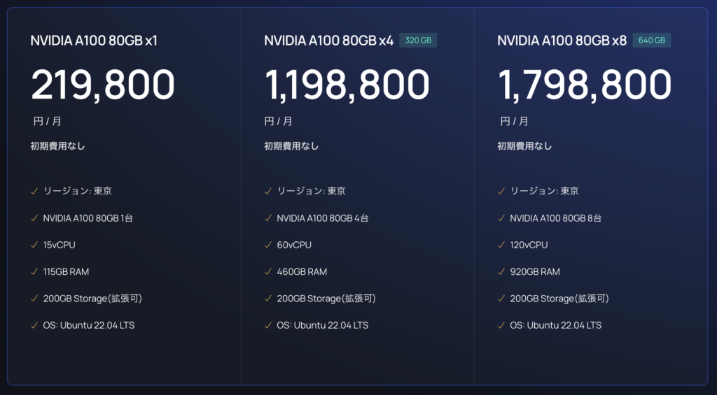 NVIDIA A100 80GB 8枚構成 最大640GB VRAM GPUを提供